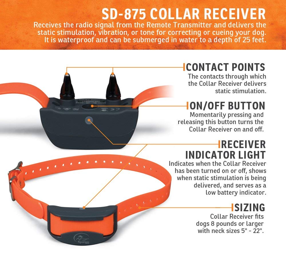 The SportTrainer 875 is designed for field training and far ranging hunting dogs (up to 1/2 mile). Featuring an easy-to-read, bright OLED screen, you can view the selected dog, static stimulation level and mode, and battery status, with just a glance. This, combined with large plus/minus buttons to easily toggle among dogs and stim levels, makes the SD-875 especially suited for multi-dog training.