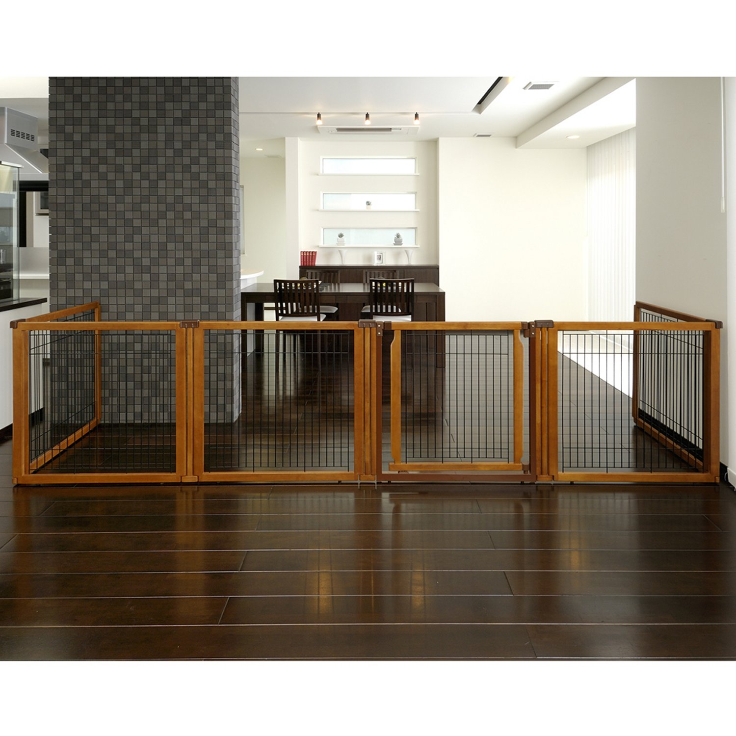 Richell's Convertible Elite Pet Gate can convert to a pen, freestanding gate, or a room divider as your pet grows. The gate includes a door panel to help you pass through the opening with ease without having to move the entire gate. Each panel locks in place at 90 and 180-degrees toprovide extra stability with specially designed caps. Convertible Elite Pet Gate comes in two heights; 31.5" and 35.8" H.
